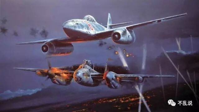 (油画上部就是世界第一种实用喷气式飞机——纳粹德国Me-262“飞燕”战斗机,有人评估其综合性能是最好活塞式战斗机美国P-51的七倍!多亏高昂的制造成本和高故障率限制了其数量,要不然能否击败纳粹空军还是个问题)
