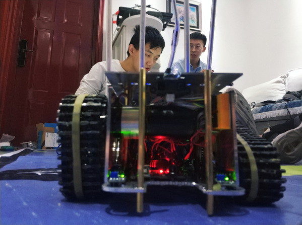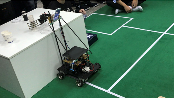 而在武术综合单打项目中,由机电学院赵嘉豪、周子阳等制作的武术机器人,采用了和其他参赛选手不同的思路。他们创新设计了超低的底盘,以防御对手机器人的进攻;采用履带结构并缠绕橡胶增强抓地力,保证在冲撞中保持重心平稳。在较强的抓地力前提下,他们采用了两台功率30W的行星减速无刷直流编码电机作为动力来源,时刻保障了充沛的动力输出和较为精确的控制。在残酷的淘汰赛中,面对相当强大的对手,他们毫不无惧,及时调试程序,更换零件,依靠精确的目标锁定与强大的动力、抓地力,一次又一次以高速将对手推下擂台,最终摘得桂冠。