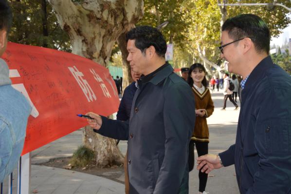为进一步树立和培养广大师生消防安全意识,传授基本的消防安全知识和技能,提高扑灭初起火灾的能力和逃生自救的能力,近日,保卫处在明故宫校区举行主题为“全员参与、防治火灾”的“119消防宣传月”大型宣传教育活动。校党委书记郑永安,纪委书记杭育新、副校长施大宁、校长助理黄炳辉先后到活动现场观摩、指导,并对今后的工作提出了要求。校内其他单位的负责人也相继来到现场,与师生互动,一起参加活动。