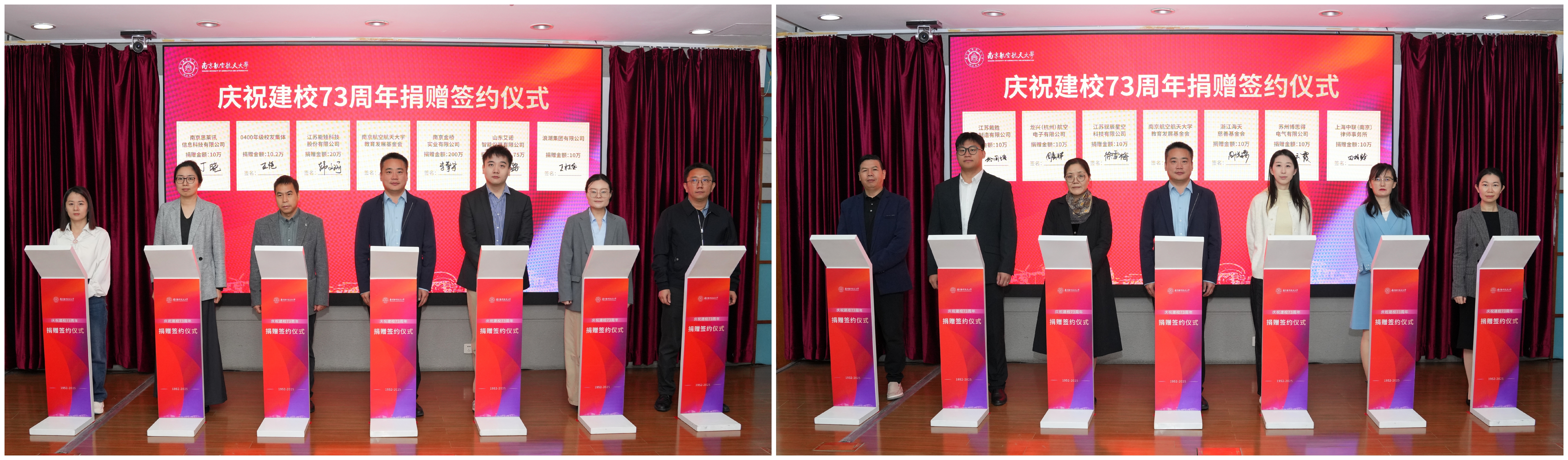 1997级校友、南京思莱讯信息科技有限公司总经理王桂金;1997级校友、志拙创业投资管理有限公司合伙人曹晨光;2001级校友、江苏能娃科技股份有限公司董事长韩文瑜;2002级校友、上海中联(南京)律师事务所主任王云霞;2024级博士校友、苏州博思得电气有限公司董事会秘书田相龄;江苏戴胜家具制造有限公司董事长姚国培;江苏驭辰星空科技有限公司总经理徐雪梅;南京金鹰国际集团招商总监李擎宇;山东艾诺智能仪器有限公司人力总监金璐;浪潮智慧科技有限公司人力与综合管理部总经理丁晓;龙兴(杭州)航空电子有限公司董事长助理周鼎辉;海天塑机集团有限公司集团雇主品牌经理周悦霖、招聘经理董宁杰等捐赠方代表出席捐赠仪式。