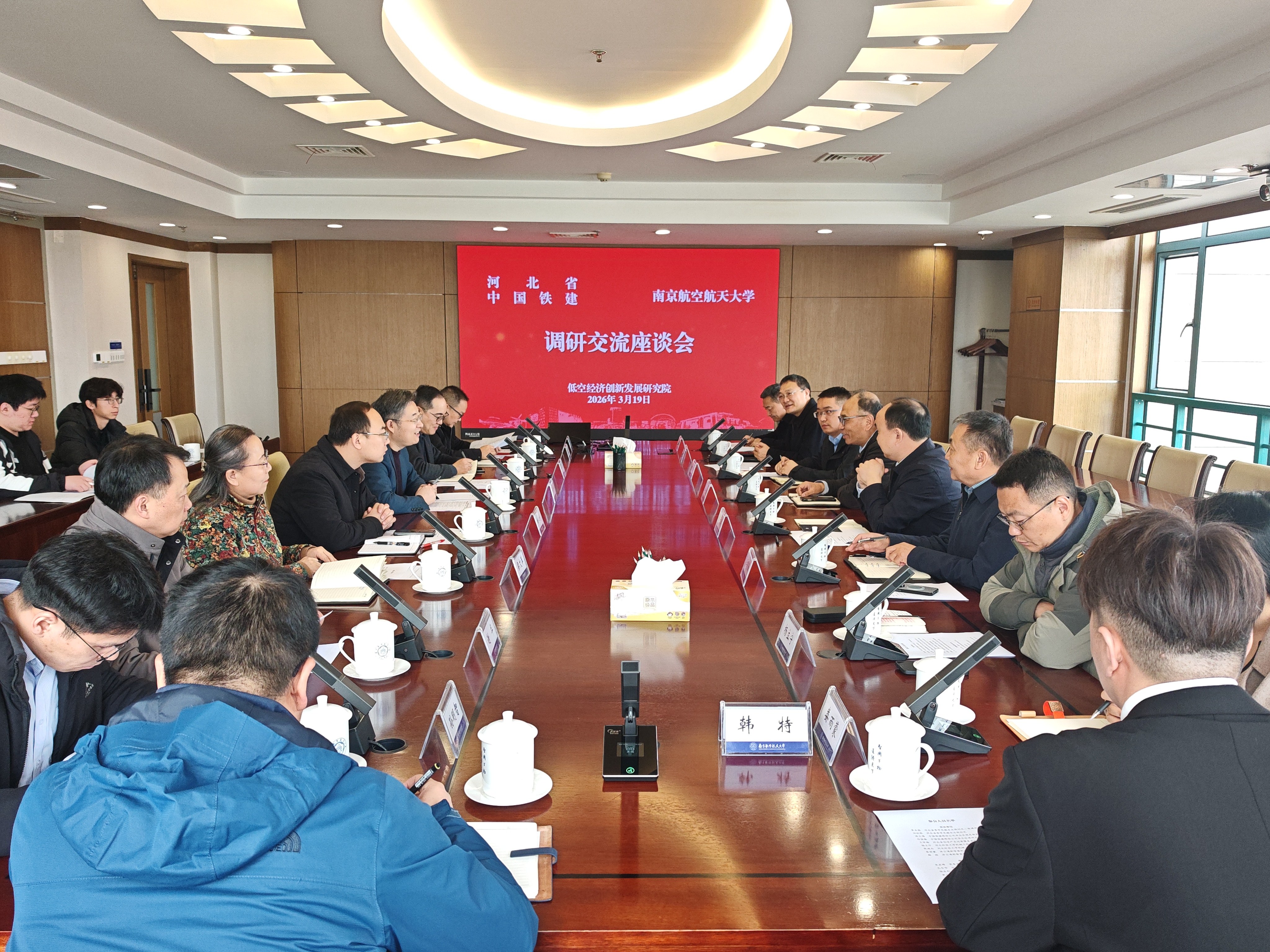 3月19日,河北省委军民融合办规划处二级调研员李永胜,中国铁建股份公司华北区域总部副总经理连文博一行来校调研,围绕航空航天和低空经济领域产学研用深度融合、校-地-企协同创新发展等开展交流。副校长吴启晖出席座谈会。