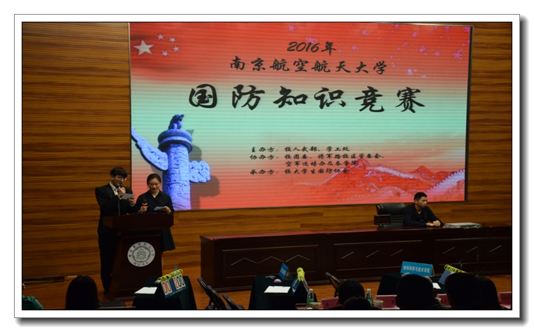 近日,2016年南京航空航天大学大学国防知识竞赛在江宁将军路校区举行。此次比赛由校人武部、学工处主办,各学院、空军选培办、校区管委会协办,校国防协会承办。全校共有6支代表队在预赛的基础上参加了决赛。 ![]() 经过激烈对决,最终能源与动力学院代表队拔得头筹,获得特等奖;航空宇航学院代表队获得最佳人气奖;国防生代表队获得最佳组织奖,其他队伍分获一、二等奖。 比赛中,参赛选手精神抖擞,主持人幽默风趣,评委字字珠玑,观众热情洋溢,充分体现了同学们对国防事业的热爱和当代大学生良好的精神风貌。本次比赛共设置军事常识必答题、兵器知识抢答题、国家安全形势现场问答和观众问答等环节,最后解放军理工大学李冀湘大校对比赛作了精彩的总结。 ![]() 本次比赛由点到面地让观摩的同学们体会到国防安全的重要性以及中国周边安全形势的严峻性,极大的激发了同学们航空报国的爱国热情,使同学们更加深刻地理解了南京航空航天大学“智周万物,道济天下”校训的内涵。 |