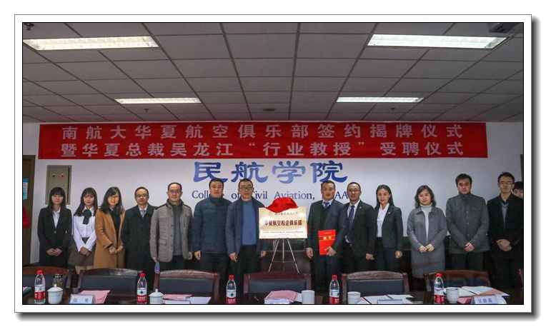 2016年12月15日,华夏航空股份有限公司签约揭牌仪式在我校将军路校区成功举行。华夏航空总裁吴龙江先生、AOC总监刘宏、人力资源部总经理尹巧妹、我校民航学院党委书记倪晓众、副院长高健、副书记方正、各系主任、教师代表、学生代表等参加了活动。倪晓众和吴龙江代表双方签订校企合作协议并为俱乐部揭牌。仪式现场,吴龙江总裁还被聘为我校的“行业教授”。