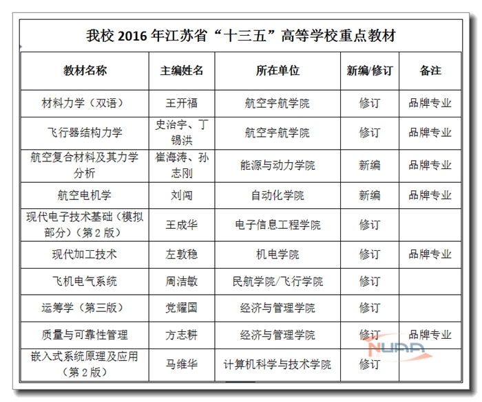 日前,江苏省教育厅发布了《关于公布2016年高等学校重点教材立项建设名单和第四批出版名单的通知》(苏教高﹝2016﹞22号),我校10本教材入选2016年省重点教材,入选教材数在江苏省高校中名列第三,其中省品牌专业核心课程教材全部入选;“十二五”期间我校省重点立项教材10本已如期出版。 省重点教材建设是江苏省全面提高高等学校人才培养质量的重要组成部分,是江苏省品牌专业建设的三大任务之一。该立项工作自2013年起已连续开展多年,“十三五”期间,省教育厅遵循“选优、选精、选特、选新”的原则,将继续每年实施立项建设工作,充分发挥我省高等教育优势,调动高校高水平教师参与,集中优势力量建设一批代表我省高等教育水平的优秀教材,打造江苏教材品牌;同时,省教育厅对已立项教材严格执行审定程序,定期公布审定通过并出版的重点教材名单。 学校将进一步加强省重点教材尤其是省品牌专业核心课程教材的培育,提高申报教材质量;加大对省重点教材的重点支持和进度管理,确保按期高质量完成建设任务;优先选用已出版的省重点教材,确保高质量教材进课堂。