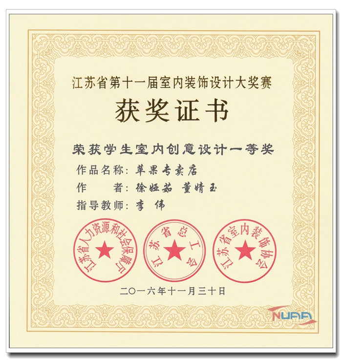 2016年11月30日,“江苏省第十一届室内装饰设计大奖赛”落下帷幕,艺术学院设计专业学生再创佳绩,其中,作品“苹果专卖店设计”荣获学生组室内创意设计一等奖。