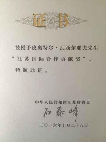 日前,经江苏省政府评选,我校立陶宛籍专家Piotr Vaslijev(皮奥特尔•瓦西尔耶夫)教授荣获2016年“江苏国际合作贡献奖”。省政府设立该奖项旨在表彰参与我省经济建设、社会发展和国际交流合作等工作并做出突出贡献的外籍人士,瓦西尔耶夫教授从近百名参选人中脱颖而出荣获此奖。