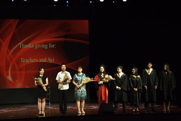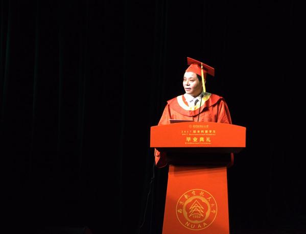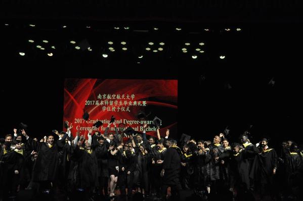 6月20日下午,“我们·最好的时光”南京航空航天大学2017届本科留学生毕业典礼暨学位授予仪式在将军路校区艺术中心举行。校长聂宏、副校长宋迎东、国际合作处处长赖际舟、教务处副处长王敬东、团委副书记张亚丽、航空宇航学院副院长钱征华、自动化学院副院长王晓琳、教师代表王彤、公寓代表陈昊、袁晓珍及Ganesh Prasad Regmi等家长共同出席了本次留学本科生毕业典礼,典礼由国际教育学院副院长张国权主持。