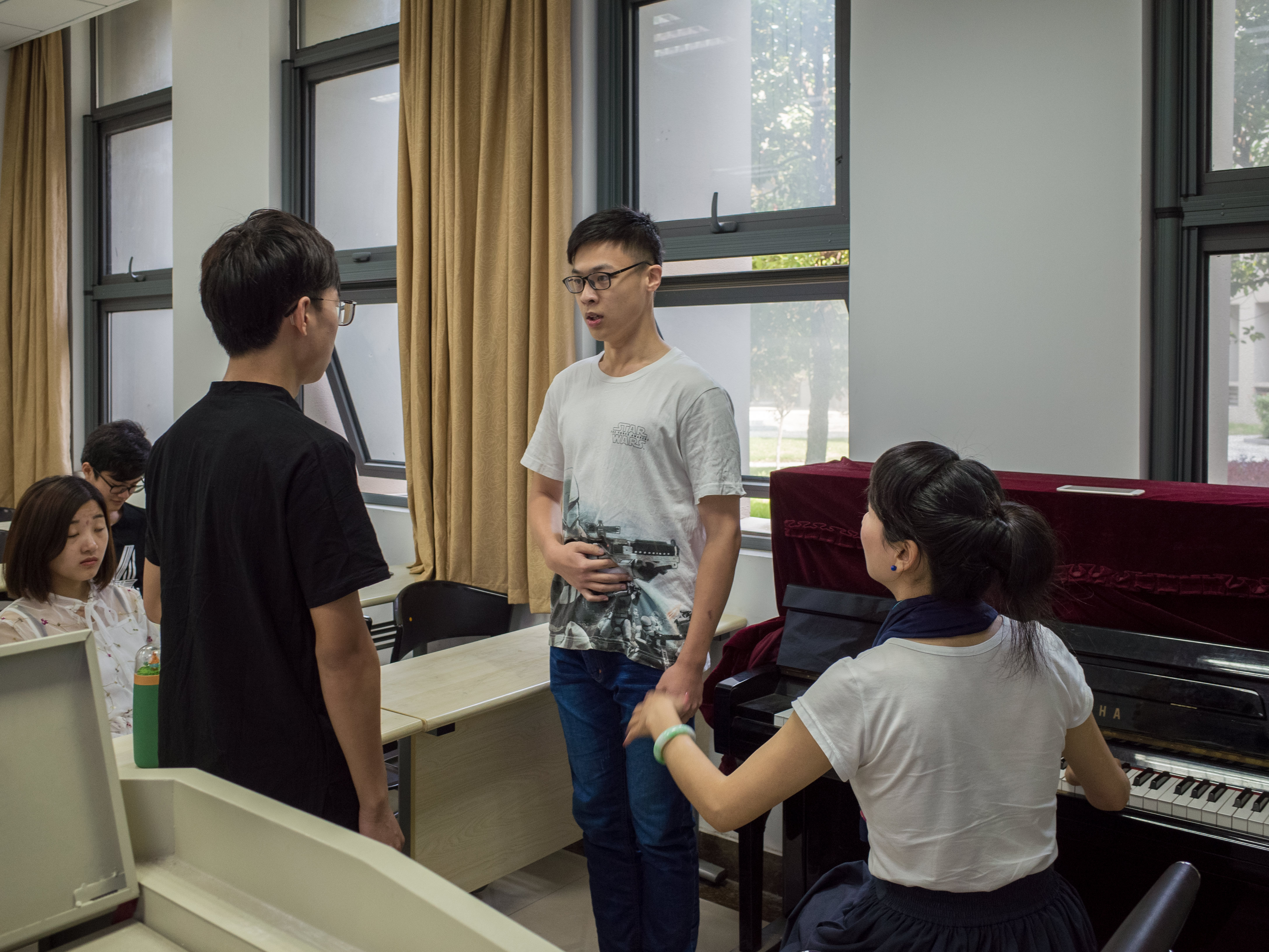 同学们对这门课程的反映也异乎寻常地热烈。起初大家以为邱爱金老师上一两次就不会再来了,当得知老师会陪伴大家完成全部课程计划时都兴奋不已。平时一下课同学们总会积极地向邱老师询问钢琴演奏、歌唱的技巧及控制方法,在最后一节课上,每个同学们上台演唱了自己的拿手歌曲,让老师打分,检验自己通过课程学习在歌唱技巧上取得的进步。两位老师从歌唱表演及控制角度对每个同学给出了不同的建议。课程结束时,同学们对控制以及歌唱都产生了浓厚的兴趣。