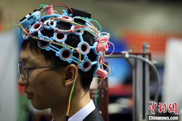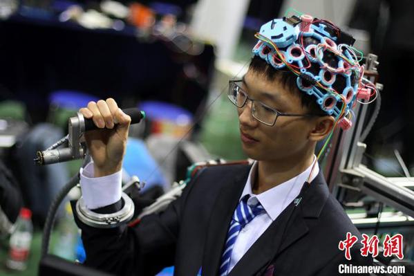 参赛大学生演示可以用脑电波控制肢体动作的“脑-机”康复机器人。 泱波 摄
