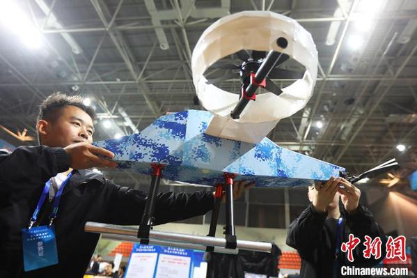 展示的无舵面涵道式垂直起降无人机。 泱波 摄