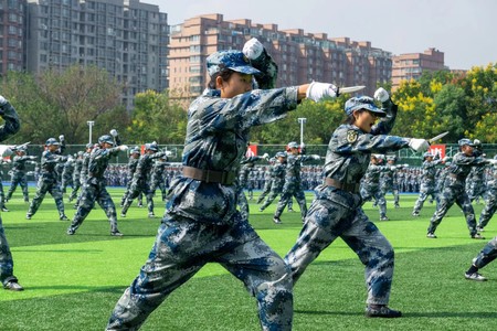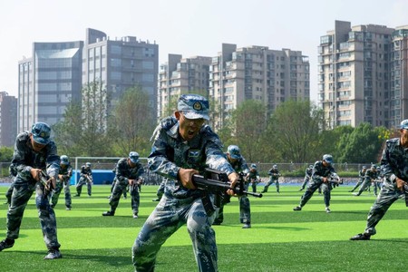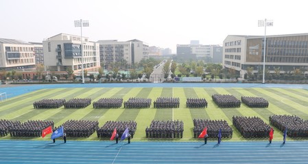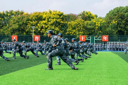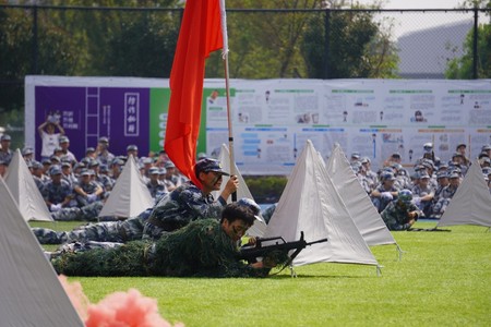 上午九点,两校区参训学生按时在指定地点集合。伴随着国歌声,鲜艳的五星红旗冉冉升起,军训汇报正式拉开序幕。由各军训营组成的12个方阵依次走过主席台接受检阅,他们步伐整齐,斗志昂扬,展现出当代大学生朝气蓬勃、奋发向上的精神风貌,赢得了全场阵阵掌声。随后,参训学生分别汇报了战术演练、刺杀操、军体拳、匕首操等项目。