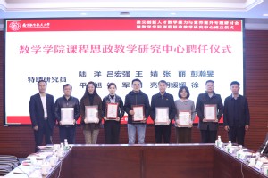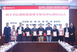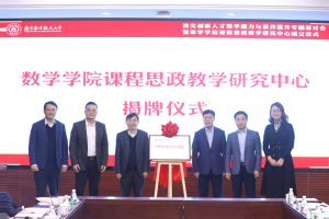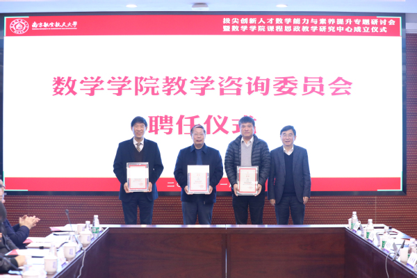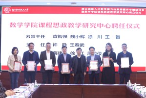 为了更好的发挥课程育人作用,数学学院联合航空学院、马克思主义学院共建课程思政教学研究中心。施大宁与数学学院、航空学院、马克思主义学院院领导共同为数学学院课程思政教学研究中心揭牌;施大宁为中心名誉主任、主任、副主任颁发聘书;孔垂谦、朱建军为中心特聘研究员颁发聘书;许静、王春武为中心研究员颁发聘书。