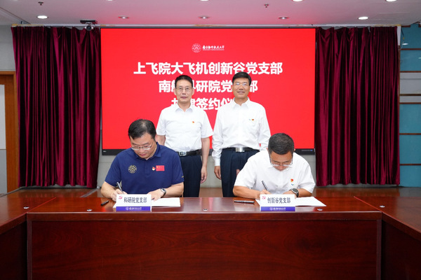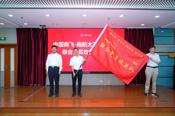 会上,双方签署了《上海飞机设计研究院大飞机创新谷党支部、南京航空航天大学科学技术研究院党支部共建协议书》,甄良和殷秀峰上台见证。签约仪式后,殷秀峰为联合党员攻关队授旗,双方党支部代表接旗。
