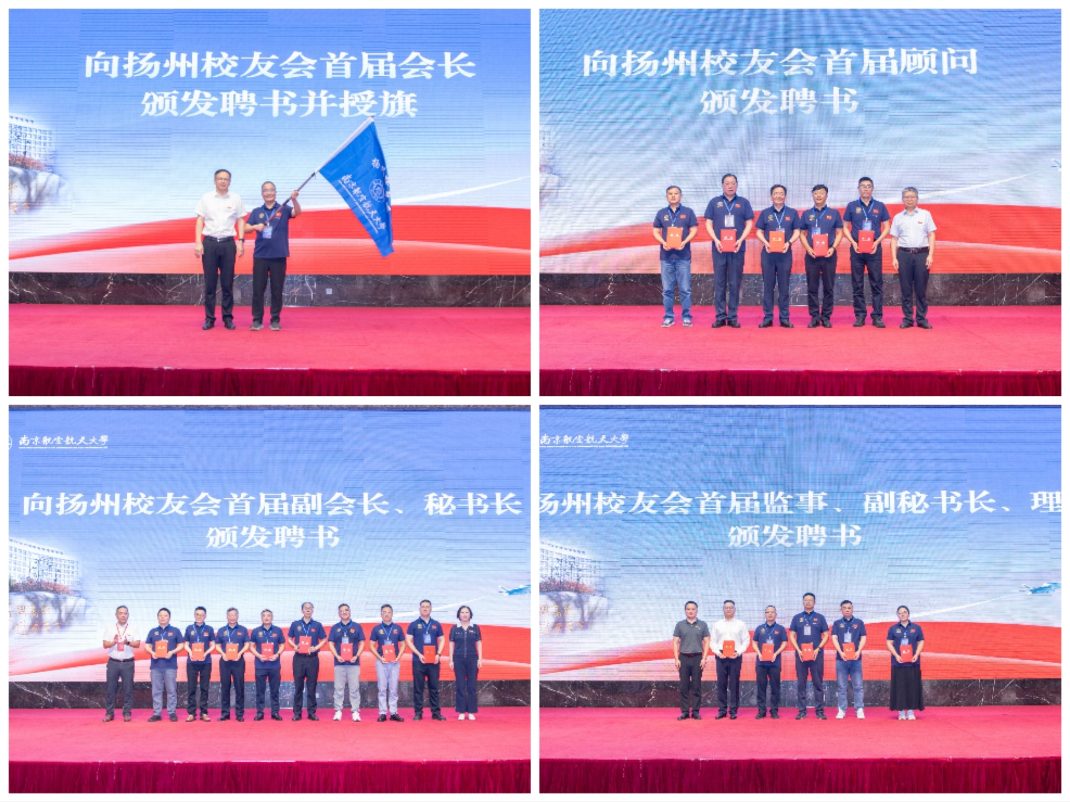 张启钱为扬州校友会首届会长颁发聘书并授予会旗,校友总会副会长李遥为首届顾问颁发聘书,审计处处长刘红旗和外国语学院党委书记左彤云为新任副会长、秘书长颁发聘书,李和新为首届监事、副秘书长、理事颁发聘书。