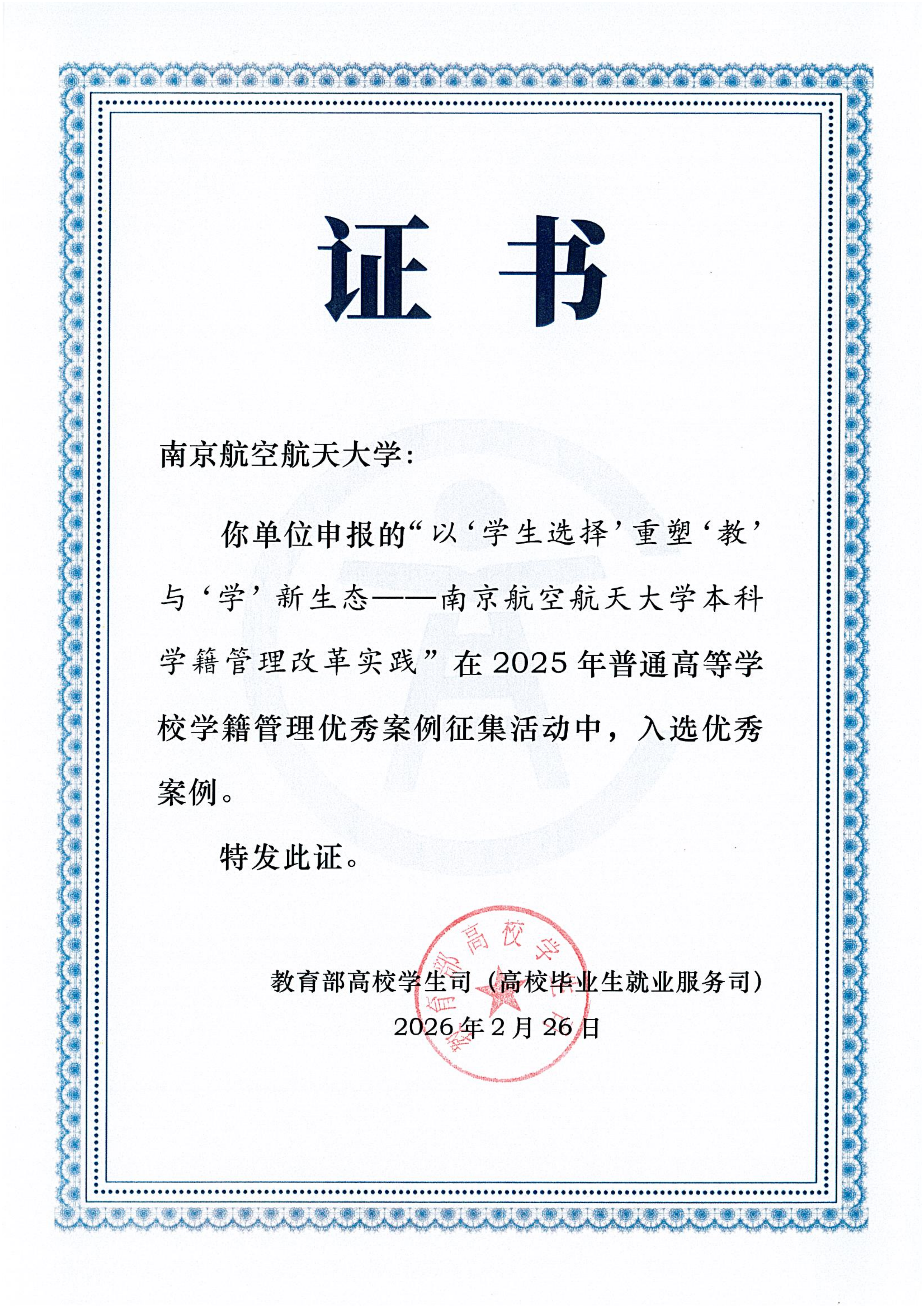此前,《从优秀生选拔到个性化支持——南京航空航天大学转专业制度改革实践》获评江苏省高等学校教务管理典型案例;针对学生个性化培养的系列改革举措先后在江苏省学籍学历管理培训会、江苏省教务管理年会上作大会交流。此次入选教育部优秀案例,是对学校学籍管理改革长期探索与阶段性成果的充分肯定,标志着我校改革实践从省级典型走向全国示范。