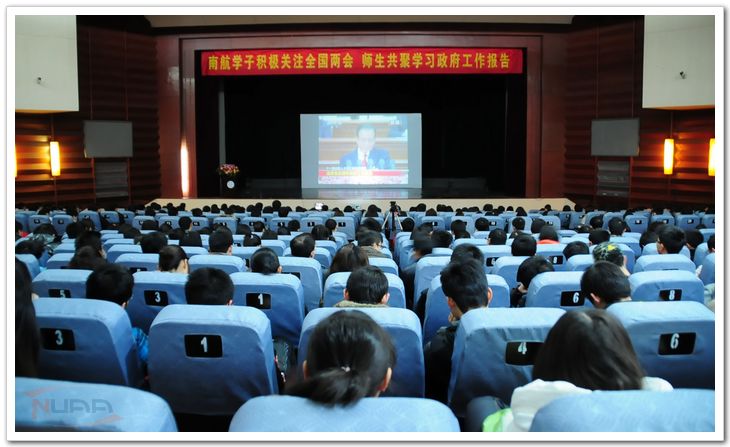 3月5日上午,来自全校14个学院的学生骨干代表、少数民族学生代表和全体学生工作人员等500多名师生聚集在将军路校区艺术中心剧场,收看十一届全国人大四次会议开幕式现场直播。本次“南航学子积极关注全国两会师生共聚学习政府工作报告”人大开幕式直播活动由学生处、研工部举办,旨在以两会召开为契机,在学生中广泛开展形势政策教育。 上午9时,报告会直播正式开始,全体师生随着国歌声的响起,一同起立,共唱国歌。在接下来的2个多小时中,师生们聚精会神地聆听温总理政府工作报告,并不时地记录着。 会后,人文与社会科学学院董英杰同学说:“聆听了政府工作报告,对我了解国情、民情,学习政治与经济理论很有帮助,也更感受到自己肩上的责任。”学生处副处长侍旭表示,通过集体收看“两会”直播,可以让学生有效地了解国家形势与政策,也为思政教育者引导学生关心国家大事、了解社会民生提供了良好的教育契机。 据悉,以两会召开为契机,各学院积极开展形势政策教育,结合实际条件自行安排地点组织学生集体观看温家宝总理政府工作报告,并鼓励学生通过网络、微博、报纸等多种渠道积极了解并参与“两会”活动。航天学院邀请市政协委员与学生一起看两会、说两会,解读与大学生生活和就业息息相关的“两会关键词”;并在直播过程中穿插“微博看两会”互动环节。材料科学与技术学院把“‘两会’直播间”设在了学生宿舍,能源与动力学院学生在总理工作报告结束后就展开了热烈的讨论。 在两会期间,各学院还将通过辅导员月讲评、组织“模拟两会”、“五说”专题讨论等活动创新形式,以年级中心组、班级、团支部、党支部、党章学习小组等为单位,通过召开班、团会,民主生活会,读书(报)交流会,专题思辨会等方式,引导学生对两会进行更加广泛深入地学习。