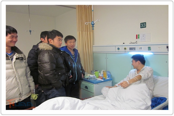 学院救助小组的老师仔细询问了于进的病情,鼓励于进同学要好好配合医生的治疗,树立信心,以积极乐观的心态勇敢面对病魔,争取早日康复;老师和学生也与于进的主治医生进行了交流,详细了解了于进的最新病情和下一步的治疗计划;并向于进的父母转达了学院领导的问候,并努力积极的想办法组织校内师生捐款和向社会寻求救助,争取早日康复,重新回到熟悉的校园和老师同学身边来!