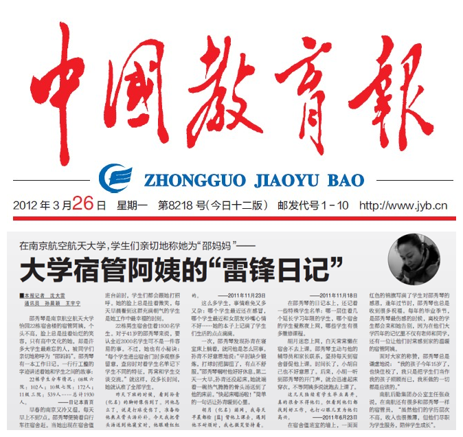 3月26日《中国教育报》12版刊登题目为《在南京航空航天大学,学生们亲切地称她为“邵妈妈”——大学宿管阿姨的“雷锋日记”》的新闻通讯,报道了我校将军路校区怡园22栋宿舍楼宿管阿姨邵秀琴爱岗敬业的事迹。 全文转载如下: