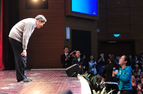 主题报告结束后,慕名而来的学子迫不及待地举手提问,主持人将第一个提问的机会给了台下席地而坐的一名女生。由于人太多,工作人员还未将麦克风传递到她手上,她已开始提问,就在这时,谁也没想到的是,上场时被搀扶着走上讲台的杨老先生,自己缓缓起身,一步一步挪到台前,弯下身子想听清楚这名女生在问什么。