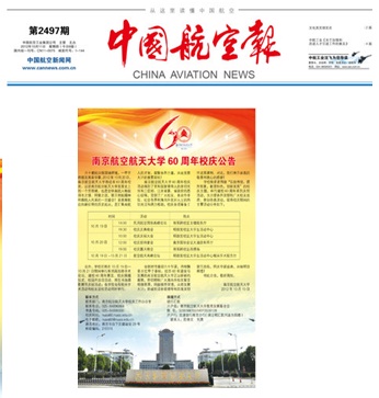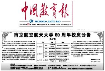 《中国教育报》《中国航空报》《中国工业报》近日陆续刊登我校60周年校庆公告(第三号)。全文转载如下: 南京航空航天大学60周年校庆公告 (第三号)