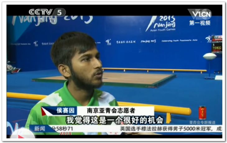 8月17日17时45分,在南京国际博览中心F馆举行的举重女子48公斤级比赛中,来自中国的15岁小将蒋惠花以183公斤的总成绩一举夺魁,摘得桂冠。本次比赛,我校志愿服务工作获得央视等多家媒体的报道。侯赛因就是受采访的志愿者之一,采访中他提到亚青会是一次国际赛事,参与成为亚青会的志愿者,是一次很好的与中国朋友交流的机会。