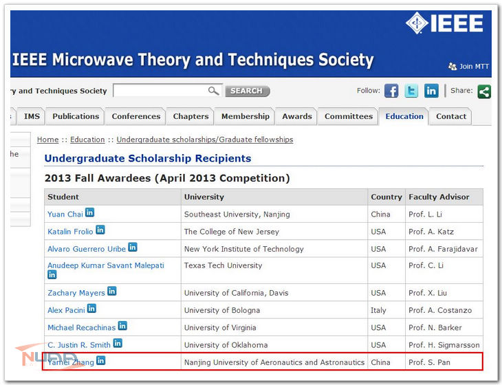 IEEE MTT-S本科生/研究生奖学金是根据申请人参与项目的学术水平、研究团队的实力以及申请人的经历等评定的。自2012年进入实验室以来,张亚梅同学已在Optics Letters (影响因子3.385), IEEE PTL(影响因子2.191)等期刊上发表SCI论文5篇,国际会议论文4篇,申请专利一项。是IEEE IMWS 2012会议三名最佳学生论文的获得者之一。