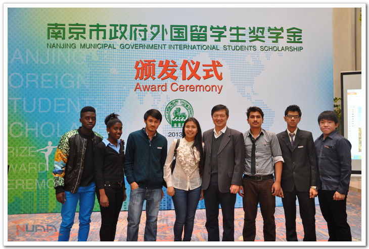 据悉,经过留学生个人申请,院校审核推荐,市教育局、市外办、市财政局会商,网上公示,市政府批准等各环节,来自亚、非、欧等5大洲83个国家的1351名外国留学生首度获颁2013年南京市政府外国留学生奖学金,我校共有132名留学生获此殊荣。副市长胡万进、市政府副秘书长、市教育局领导为获得南京市政府外国留学生奖学金的留学生代表颁发奖学金证书并合影留念。