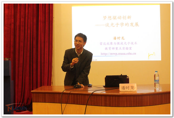 开幕式之后,本届“枭龙杯”学术论坛主论坛正式拉开帷幕。我校青年教授潘时龙作了题为“梦想驱动创新——谈光子学的发展”的精彩讲座。他首先将信息技术的发展速度引申到汽油、手机、汽车等身边事物,让大家形象直观地了解了信息技术发展速度之快。他以一个个凭借梦想为光子学发展做出突出贡献的科学巨人为例,详细阐述了相干的梦想如何驱动激光的最终诞生,透明的梦想怎样促使光纤的发明出现,集成光子芯片又怎样在集成的梦想中被孕育。深入浅出的讲解、通俗易懂的比喻使同学们深深地感受到梦想对于创新的重要性。他在讲座中还指出了我国学生在学习中存在的一些常见问题,如:不求甚解、为考试而读书、不懂学以致用、少读书、怕动手等,发人深省,引人深思。最后,他以梦想改变人生的例子结束他的演讲,激励同学们怀揣梦想、笃定前行。潘时龙教授诚恳的言辞、殷切的期盼引起同学们内心的强烈共鸣。
