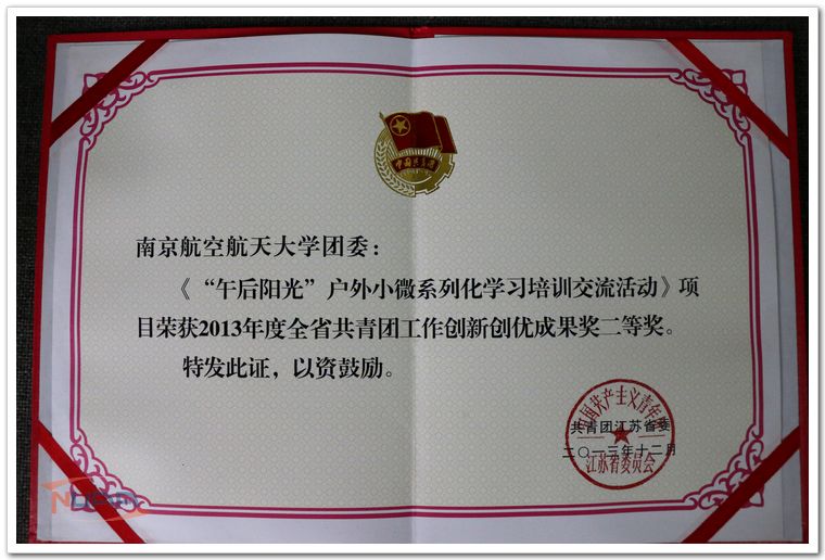 在1月2日-3日召开的江苏团省委十四届二次全会上,团省委表彰了2013年度全省共青团工作创新创优成果奖,我校团委申报的《“午后阳光”户外小微系列化学习培训交流活动》项目荣获2013年度江苏省共青团工作创新创优成果奖二等奖,成为继思辨类思想引导活动、未来精英培育工程等项目后我校又一在全省范围内推广的共青团工作先进经验做法。 此次全省共青团创新创优成果奖申报评选工作自2013年11月启动,共有来自各市级团委、县级(市、区)团委、大学生村官申报的项目220个。团省委根据各个项目在工作实践中取得的具体成效,结合各个项目的创新性、影响力和可推广价值,初选出120个项目进行网络投票,根据网络投票结果,经专家评审和书记室研究决定,最终产生10个一等奖项目、20个二等奖项目以及30个三等奖项目。