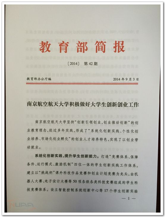 近日,教育部全文刊发《南京航空航天大学积极做好大学生创新创业工作》专题工作简报。