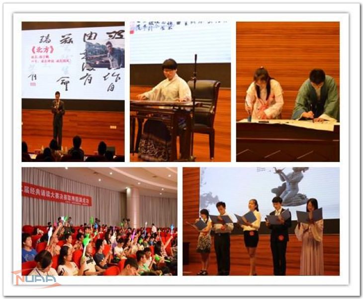 9月28日晚,由校语言文字工作委员会主办、校语委办携手大学生国学社、书法协会承办的“经典诵读大赛暨培育和践行社会主义核心价值观——经典诵写讲系列活动展演”在将军路校区举行。教务处王成华处长、朱建军副处长、图书馆杨兰芳副馆长出席活动并为获奖选手颁奖。 展演通过经典诵读决赛、征文及书法作品展示、表演让现场同学近距离的感受传统文化,体会核心价值观,共同献礼国庆65周年。作为经典诵写讲系列活动的压轴赛事,经典诵读大赛还邀请了《南航报》主编于媚、电视台播音员周敏燕、大学语文教授郎大地以及经济与管理学院优秀辅导员佘明担任评审。通过初赛、新生挑战赛选拔出10名选手直接晋级决赛,另有10名待定选手以集体诵读形式参加复活赛竞争决赛最后两个名额。本次活动旨在引导在校大学生培育和践行社会主义核心价值观,开展涵养社会主义核心价值观的实践活动,结合我校培养高素质公民理念,引领校园文化思潮,在优秀文化传承和思想文化创新方面作贡献。在语委办的指导下,社团的同学们精心组织策划,积极宣传,并设计了复活赛中大众评审点“赞”、书法展示中现场书写、送24字等环节,让现场同学愉快地融入展演活动中。整场比赛围绕核心价值观的国家、社会、公民三个层面展开。最终,能源与动力学院、经济与管理学院和继续教育学院获得“培育和践行社会主义核心价值观——经典诵写讲系列活动”优秀组织奖,来自民航/飞行学院的韩宇鹏获得“经典诵读”一等奖。 ![]() ![]() |