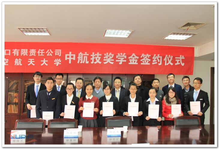 12月4日下午,中航技奖学金签约仪式在我校明故宫校区举行。中航技进出口有限责任公司党委副书记唐建明,校党委副书记、副校长陈夏初,中航技进出口有限责任公司人力资源部部长唐星,研工部副部长孙占久,校学生处副处长陈修文、许爱华,中航技进出口有限责任公司人力资源部主管李钧以及获得2014年中航技奖学金的12名本科生及研究生出席了本次签约仪式。由唐建明与陈夏初代表中航技进出口有限责任公司和南京航空航天大学共同签署了新的奖学金协议。