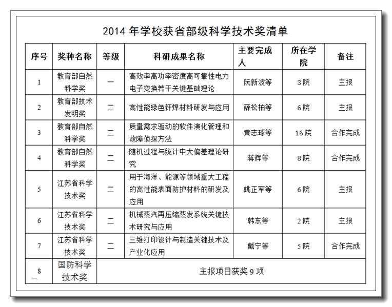 近日,教育部、工信部和江苏省等相关部门正式公布了2014年度科学技术奖评选结果,我校16项科研成果获2014年度省部级科学技术奖。我校获教育部高等学校科学研究优秀成果奖(科学技术)4项(自然科学一等奖1项,自然科学二等奖2项,技术发明二等奖1项),获奖数在工信部所属院校中排名第二,其中阮新波教授团队的科研成果获教育部自然科学一等奖;我校获江苏省科学技术二等奖3项;我校主报项目获国防科学技术奖9项(一等奖1项、二等奖3项、三等奖5项),获奖数在工信部所属院校中排名第二,其中昂海松教授团队的科研成果获国防科技进步一等奖。详见下表: