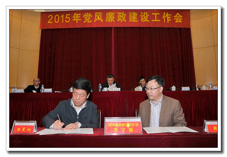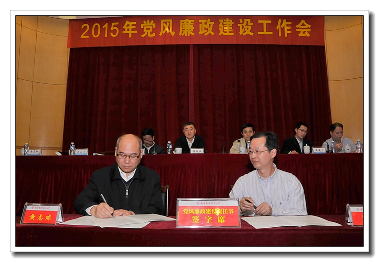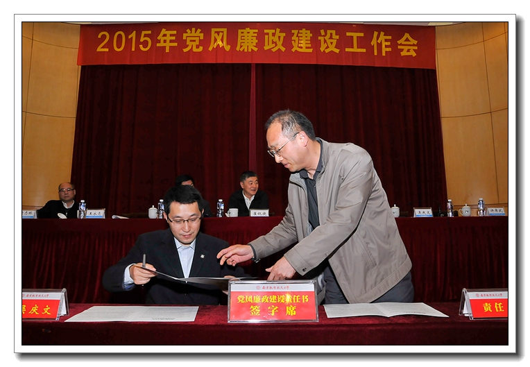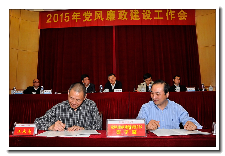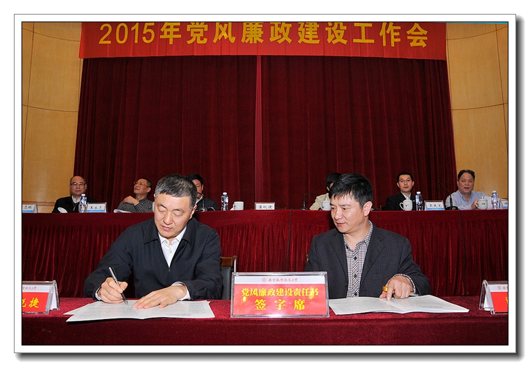 校长聂宏在总结中强调,各单位负责人要认真组织学习本次会议精神,根据学校的统一部署,结合本单位的实际,研究制定本单位党风廉政建设具体工作计划和任务。各级领导干部要进一步增强责任感和紧迫感,坚持党风廉政建设与本单位的中心工作一起谋划、一起部署、一起考核,真正把主体责任落实到位,扎实把每样工作抓具体、抓深入,确保事事有着落、件件有结果。要聚焦遵守党的纪律,纠正四风,重点领域专项治理等方面存在的突出问题,敢于出实招、下猛药,一件一件的抓,一项一项的改,确保取得明显成效。要坚持改革创新,健全工作制度,加强工作队伍,完善工作机制,善于运用法治思维和法治方式,系统化推进本单位的党风廉政建设,努力打造山清水秀的廉政生态,为加快推进深化校内综合改革提供坚强有力的保障。 为切实压紧压实压牢党风廉政建设主体责任,会上举行了党风廉政建设责任书签订仪式。校党委书记、校长分别与院级党组织书记、学院和教学单位行政负责人及分管职能部门负责人,校领导班子成员与分管职能部门负责人现场逐一签订了党风廉政建设责任书,进一步明确责任范围,规范考核要求,强化责任追究,传导工作压力。