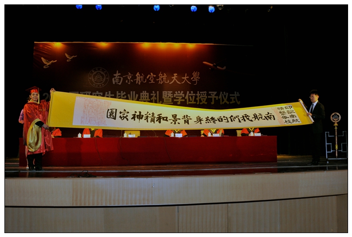 机电学院研究生陈瑶光代表全体毕业生向母校赠送《印记南航》。《印记南航》字卷由艺术学院美术学书法专业毕业生范正霞书写,2015届毕业生们在上面郑重盖上了自己的毕业纪念名印。“如果说专属个人的一方印章是母校对我们每个人的百分百关爱,那这幅字卷就是我们每一个人心底对母校最深、最真的承诺和期许!”。毕业生发言代表雷芸代表全体毕业生深情承诺:无论我们走到哪里,都将带着“情系母校,印记南航”的学子情怀,南航,是我们永远的终身背景和精神家园!”聂宏校长代表学校接受毕业生赠礼。