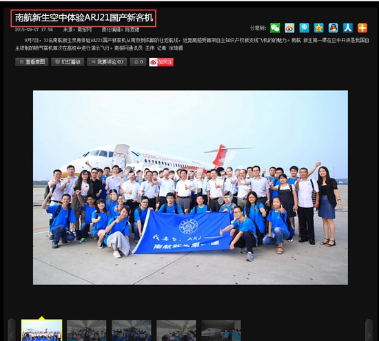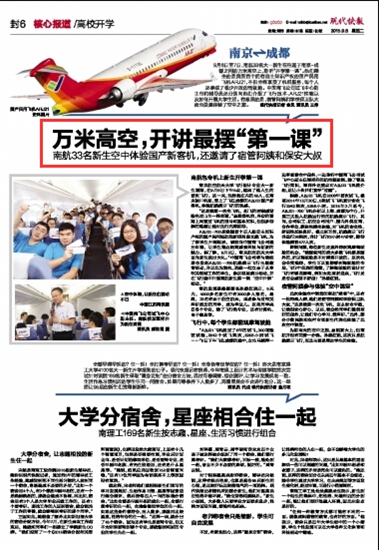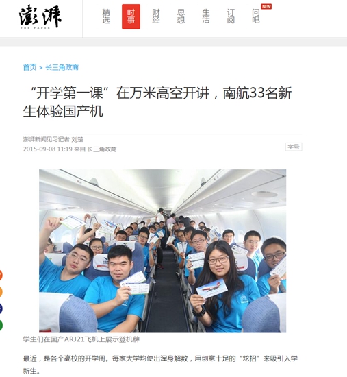 9月6日至7日,我校33名本科、研究生新生及部分教职工代表亲身体验ARJ21国产新客机从南京到成都的往返航线,在飞行途中进行了主题新生教育,活动取得了圆满成功,并得到了中央电视台、中国教育电视台、江苏电视台、新华日报、现代快报、扬子晚报、新华网、光明网、中国新闻网、凤凰网、澎湃新闻网等十余家国家级、省市级媒体的报道。通过这些报道,集中展示了南航人才培养和特色办学的理念,为学校赢得了良好的社会声誉。 附:相关媒体报道 ![]() 中央电视台新闻频道 ![]() 中国教育电视台 ![]() 南京晨报:http://njcb.jschina.com.cn/mp3/html/2015-09/08/content_1305505.htm ![]() 南报网:http://www.njdaily.cn/2015/0907/1208430.shtml#g1208427=1 ![]()