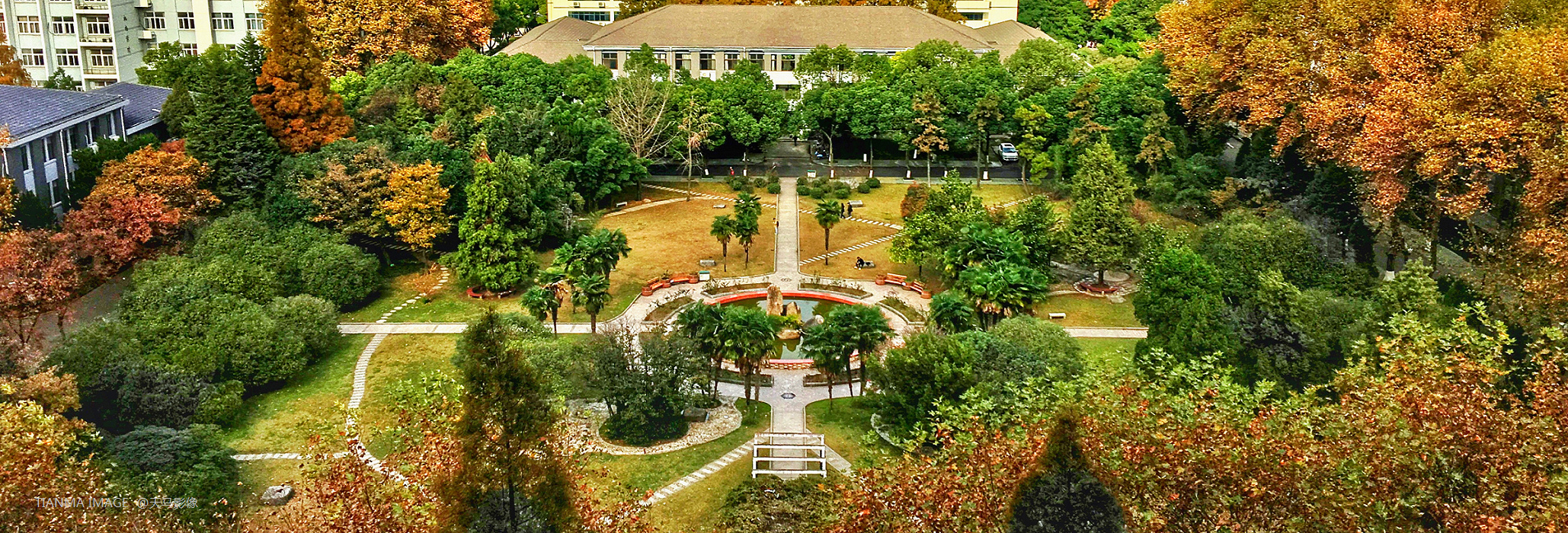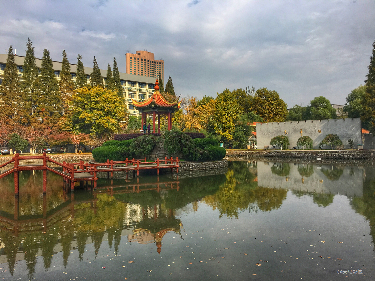 一鉴圆池,一围方林,天圆地方;水滋万物,林庇众生,周转乾坤。小小园景,竟蕴含着“智周万物,道济天下”的校训哲理。