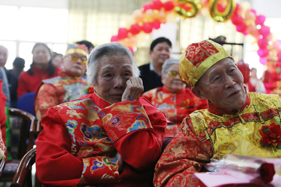 随着典礼开始,11对金婚夫妇手拿玫瑰,伴随着婚礼进行曲陆续入场。他们身着唐装礼服,在婚礼进行曲和众人阵阵欢呼声中,一一穿过色彩缤纷的气球拱门,携手踏上红地毯,在众人见证下,相扶相搀走向属于他们的舞台。一双双微微颤抖却紧握在一起的手,一张张布满皱纹却洋溢着温馨的笑脸,他们之间的每一个动作,都传达出对爱情的执着、包容与体谅,让在场的观众感动不已,并随着相机快门的声音成为永恒。