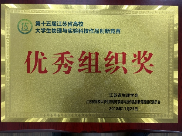 近日,在江苏省高校第十五届大学生物理及实验科技作品创新竞赛决赛中,我校9个参加决赛的项目全部获奖,其中一等奖1项,二等奖4项,三等奖4项。同时,我校获得了优秀组织奖。