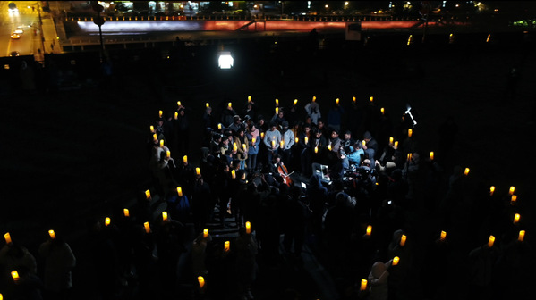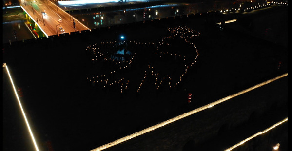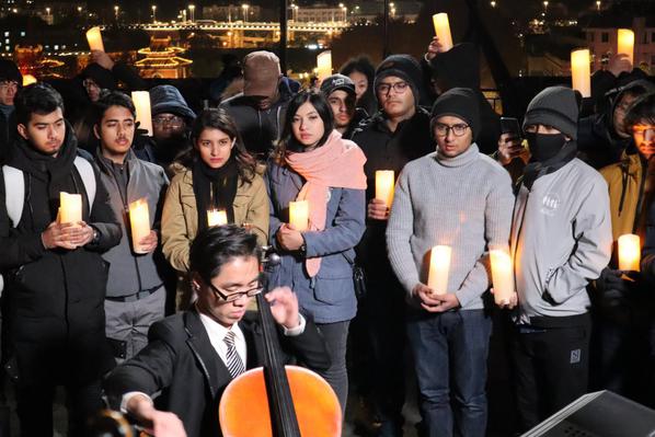 当夜的南京寒潮来袭,初雪降临,夜幕下,中华门瓮城平台格外清寒。冷冽的寒风中,我校300余名中外学生用电子烛光绘成“和平鸽”图形,橄榄枝、紫金草等图形及中英文“和平”字样,传递了高校学子对追求和平的美好愿望。