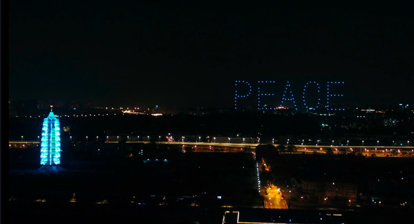 当无人机编队缓缓停留在长干桥上空,“PEACE”(和平)在静静流淌上千年的秦淮河前定格,和平之夜的祝福——山河壮美,天长地久;人民幸福,世界和平。