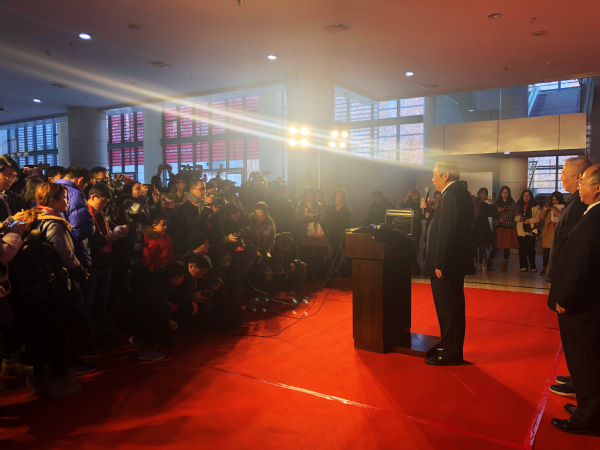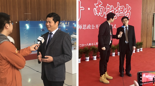 思政公开课开始前,专门设置了“总师通道”,五位总师一同亮相接受媒体的集体采访,新华社、中央广播电视总台、光明日报、中国日报、科技日报、中国青年报、中国新闻社、中国教育报、新华日报、江苏卫视等三十余家媒体进行了采访和报道,其中,“对话总师”环节得到了新华社和央视新媒体的全网直播。