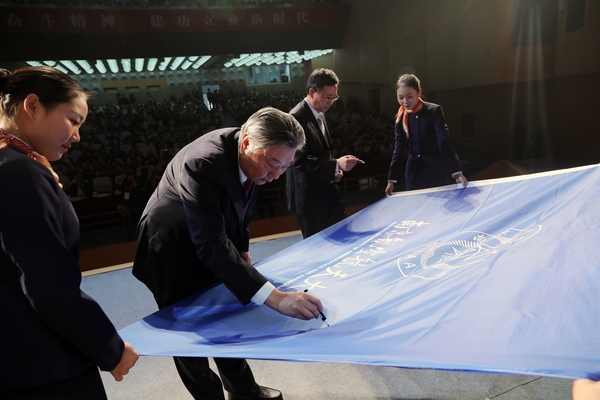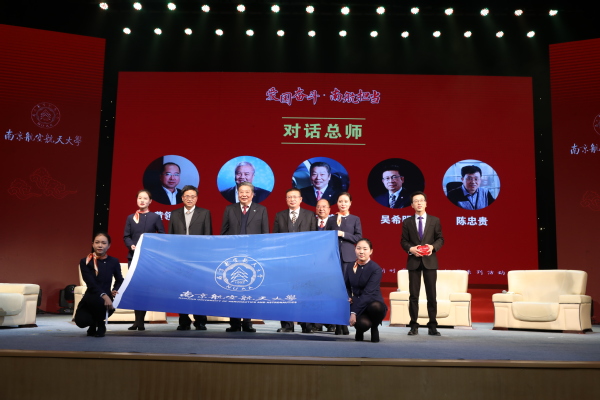 同时,在五堂公开课之间,设置了“对话总师”环节,由徐川与五位总师进行对话。在对话中,五位总师回忆南航求学时光,言语间显露出浓浓母校情,并通过线上征集、现场提问与师生进行了互动,并一一寄语母校师生。“总师对话”环节结束之后,五位总师在校旗签名留念。