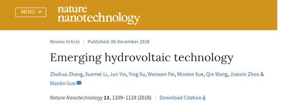 12月6日,《自然-纳米技术》(Nature Nanotechnology)以“Emerging hydrovoltaic technology” (正浮现的水伏技术)为题在线发表了我校纳米科学研究所团队关于水伏效应研究的综述成果。该刊编辑在期刊封面上以“Hydrovoltaics—new ways of harvesting electricity from water”(水伏学)推荐了该成果。