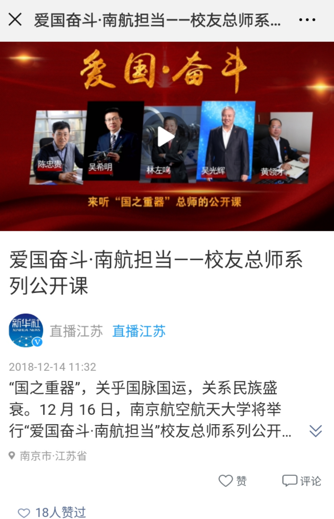 江苏工人报:南京航空航天大学“爱国奋斗·南航担当”校友总师思政公开课启动