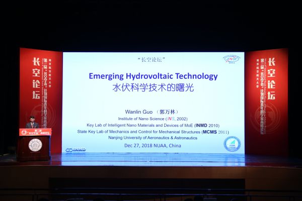 中国科学院院士、著名力学家、南航纳米科学研究所所长郭万林教授作了题为《水伏科学技术的曙光》的专题报告。郭万林用深入浅出的语言揭开了水伏科学的神秘面纱,揭示了水伏效应机理和全球研究现状,系统全面介绍了团队重大研究贡献和广阔发展前景,描绘了人类水能源深度开发利用的未来。