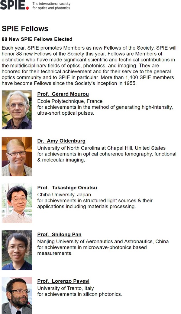 近日,国际光学工程学会(SPIE)宣布了新入选的2019年度会士(Fellow)名单,我校电子信息工程学院潘时龙教授成功入选。