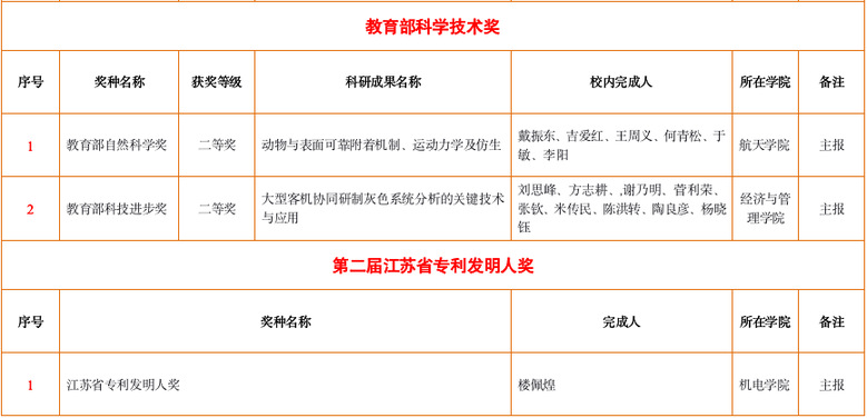 2018年,继获得两项国家科学技术奖以后,我校在部省级科研成果奖方面也取得新突破。近日,国家教育部、国防科工局以及江苏省等相关部门公布或公示了2018年度科研成果奖评选结果,我校获部省级科研成果奖30项(特等奖1项,一等奖6项),并首次获江苏省专利发明人奖1项。