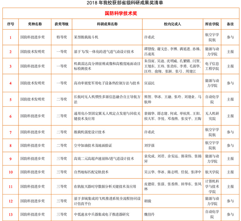 2018年我校获得国防科学技术13项(特等奖1项,一等奖3项,二等奖4项,三等奖5项)。二院谭慧俊教授团队的“基于飞/发一体化的进气道气动设计技术”获国防技术发明一等奖,四院朱岱寅教授团队的“机载雷达高分辨前视成像和高精度地面动目标检测技术”获国防科技进步一等奖,一院许希武教授参与的“某型舰载战斗机”获国防科技进步特等奖,二院宣益民教授参与的“高功率密度军用电子设备热控制方法与技术”获国防技术发明一等奖。学校获国防科学技术一等奖以上4项是近年来获奖数最多的一年。