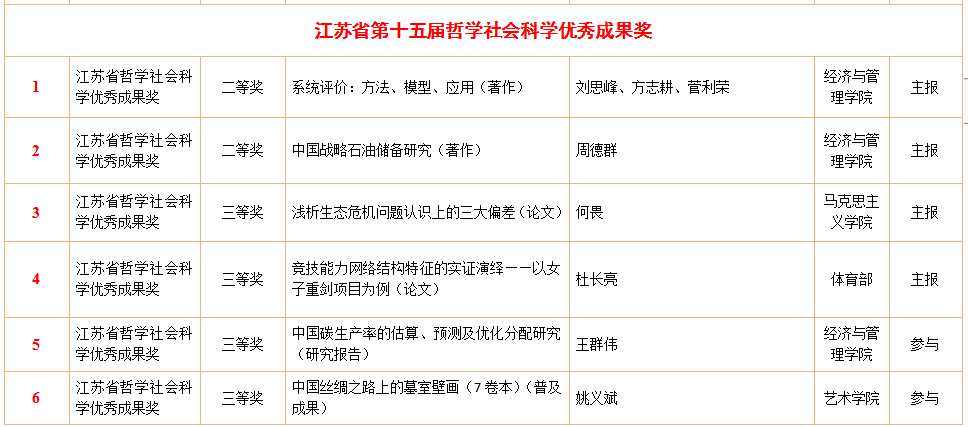2018年我校获江苏省第十五届哲学社会科学优秀理论成果奖6项,其中二等奖2项,三等奖4项;获教育部高等学校科学研究优秀成果奖(科学技术)2项。